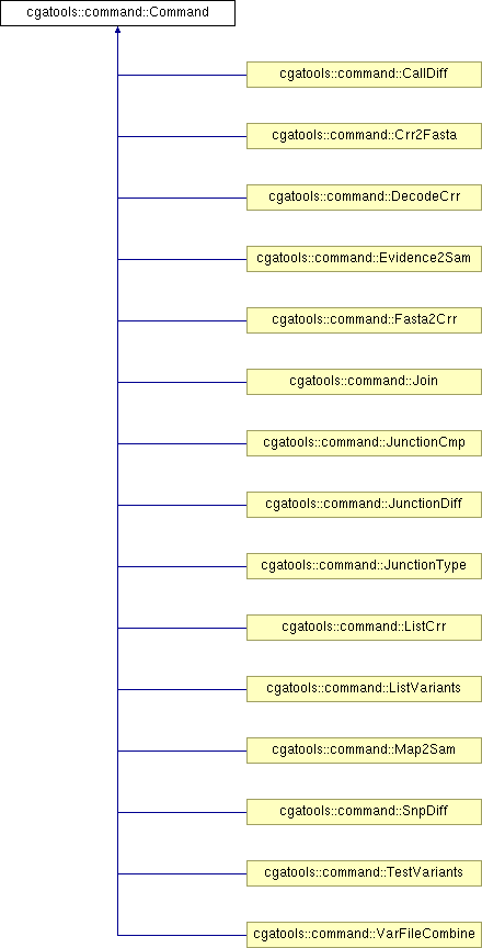 Implemented in cgatools::command::CallDiff, cgatools::command::Crr2Fasta, cgatools::command::DecodeCrr, cgatools::command::Evidence2Sam, cgatools::command::Fasta2Crr, cgatools::command::Join, cgatools::command::JunctionCmp, cgatools::command::JunctionDiff, cgatools::command::JunctionType, cgatools::command::ListCrr, cgatools::command::ListVariants, cgatools::command::Map2Sam, cgatools::command::SnpDiff, cgatools::command::TestVariants, and cgatools::command::VarFileCombine.